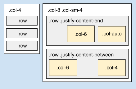 On note qu’ici, utiliser .col et .col-6 est équivalent car on a fixé la div de droite à 6 colonnes, ce qui laisse 6 colonnes utilisables par la div de gauche dans l’espace restant.