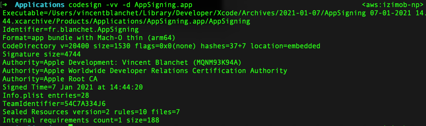 Les informations d’identité sont contenues dans le bundle. On peut les afficher grâce à la commande codesign :