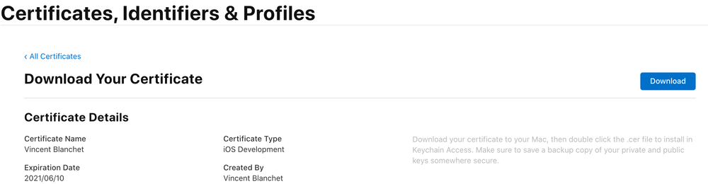 De ce fait, si l’on travaille à plusieurs sur une application, il faut partager ce certificat et sa clé privée pour que tous les développeurs puissent signer l’application. Pour ça il faut l’exporter vers un fichier .p12 qui peut facilement être partagé.