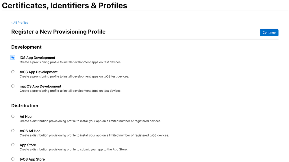 Sélection d’un type de provisioning profile :