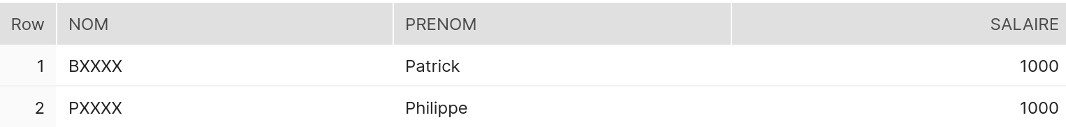 Désormais, lorsqu’un utilisateur avec le rôle RH requêtera la table il verra les données en clair. Les autres utilisateurs, par contre, verront des données transformées, comme suit.