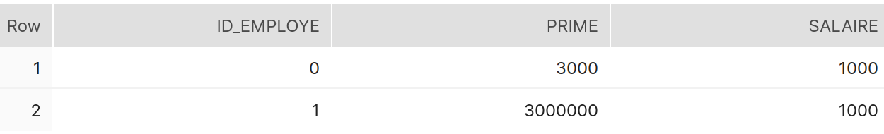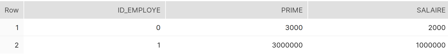 - PRIME : cette table contient trois colonnes : ID_EMPLOYE, SALAIRE, PRIME
