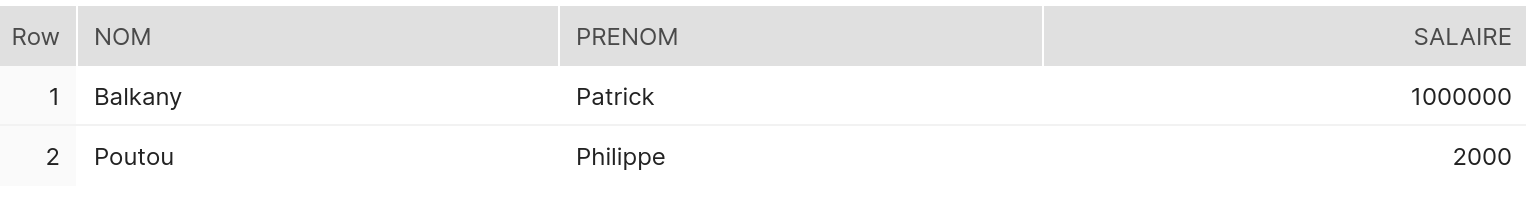 | NOM | PRENOM | SALAIRE | NOM | PRENOM | SALAIRE |