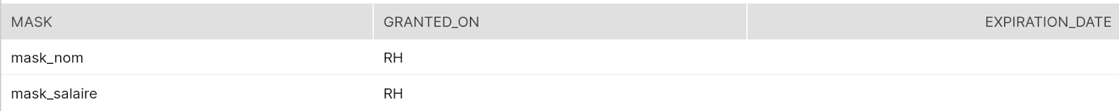 alter table if exists EMPLOYE modify column SALAIRE set masking policy mask_salaire;Si le rôle utilisé pour l’exécution des requêtes (le résultat de la fonction contextuelle current_role()) n’est pas RH, les valeurs de la colonne SALAIRE seront remplacées par 1000, sinon elles ne seront pas modifiées.
