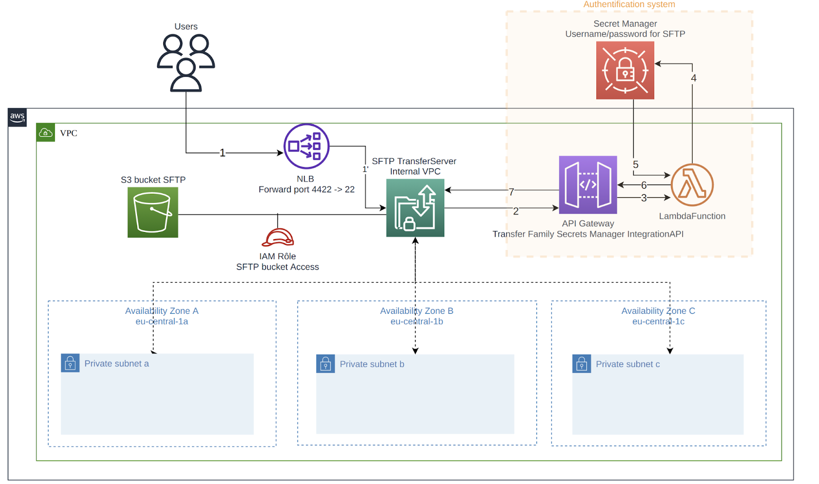 Pour l’authentification, AWS Transfer propose seulement une authentification avec clés mais nous souhaitions aussi avoir une authentification possible avec login et mot de passe.