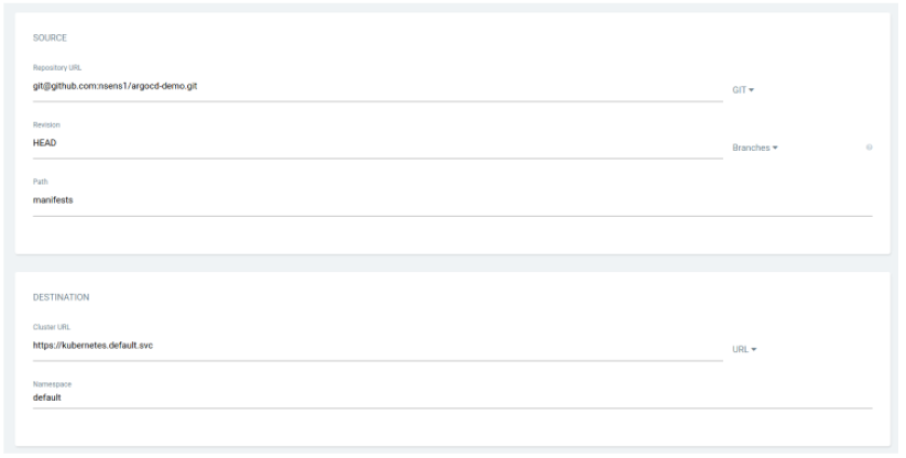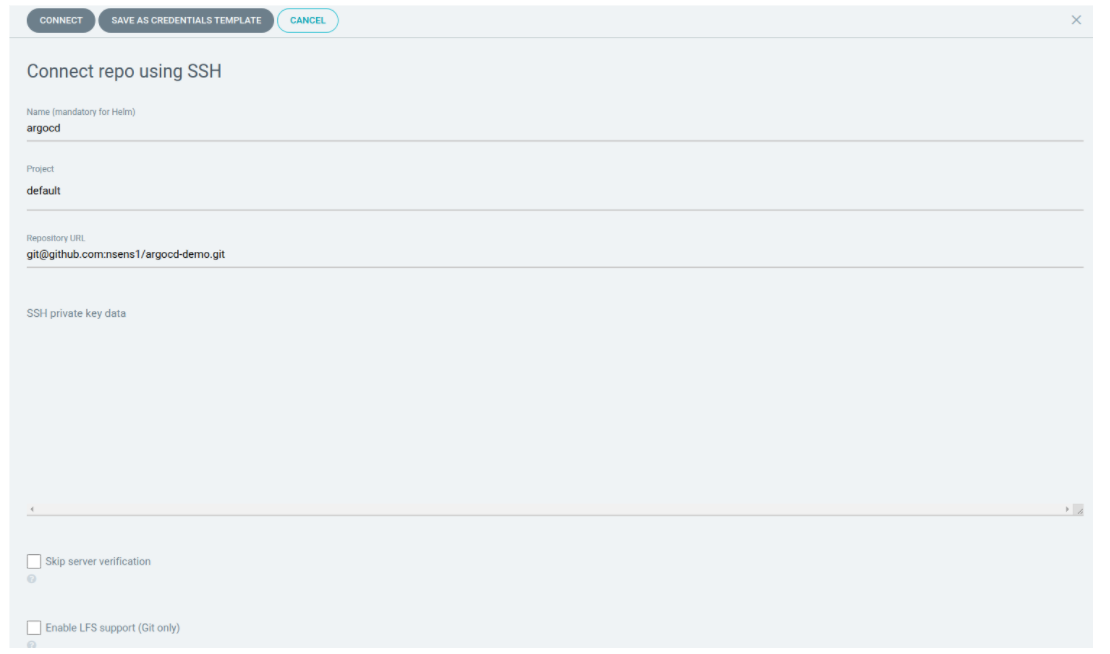Nous allons indiquer ici les informations d’accès au répertoire, nous devons attribuer une clé SSH privée (sans mot de passe) rattachée à notre compte GitHub pour qu’Argo CD puisse accéder au répertoire et récupérer les éléments désirés.