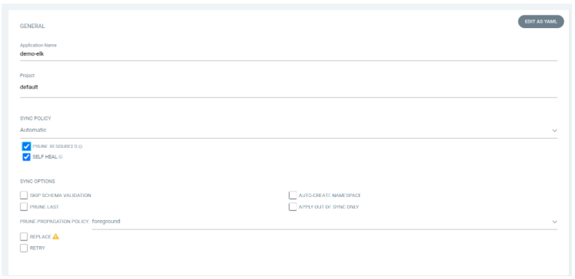 Sur l'image ci-dessus, nous avons indiqué le lieu où est stocké notre projet, la branche du répertoire git que nous utilisons et notre dossier “manifests” contenant la stack ELK que nous allons déployer.