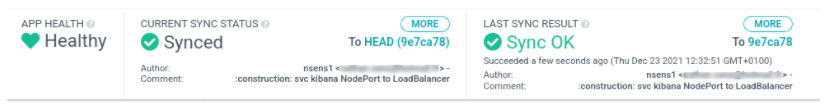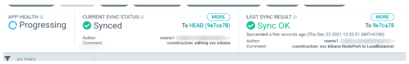 Notre application est maintenant déployée mais nous allons la modifier pour voir la réaction d’Argo CD. Dans cet exemple, j’ai édité le fichier “service-kibana.yaml”.