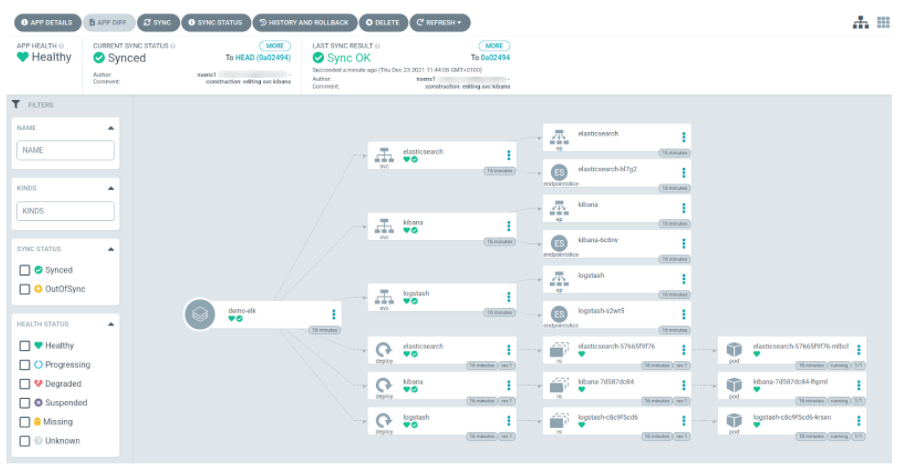 On aperçoit sur l’image ci-dessus l’état de nos ressources ainsi que celui de l’application. Argo CD nous permet également de voir l’état de la synchronisation en direct avec le répertoire.