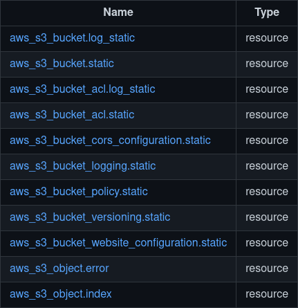 Le module contient un bucket source, un bucket de logs, des ACL pour chaque bucket, des ressources de configuration pour les CORS, les logs, les policies, le versionning et le service pour le bucket source, et pour finir deux ressources Terraform copiant dans le bucket deux pages HTML pour l’index et l’erreur.