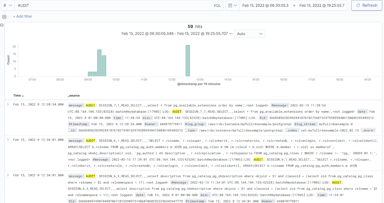 Une fois l’apply terminé, vous devriez pouvoir afficher l’instance kibana (fourni dans les outputs) et voir en quasi temps réel les logs de la base. Si on génère un peu d’activité, vous devriez voir quelque chose comme ceci :