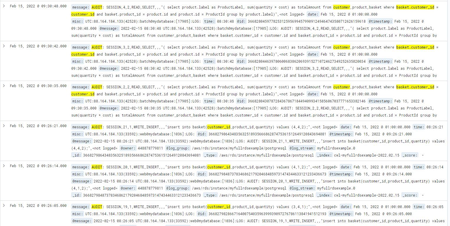 On peut filtrer les logs d’audit pour sortir toutes les requêtes exécutées sur la table customer par exemple : message:*AUDIT* and message:*customer* :