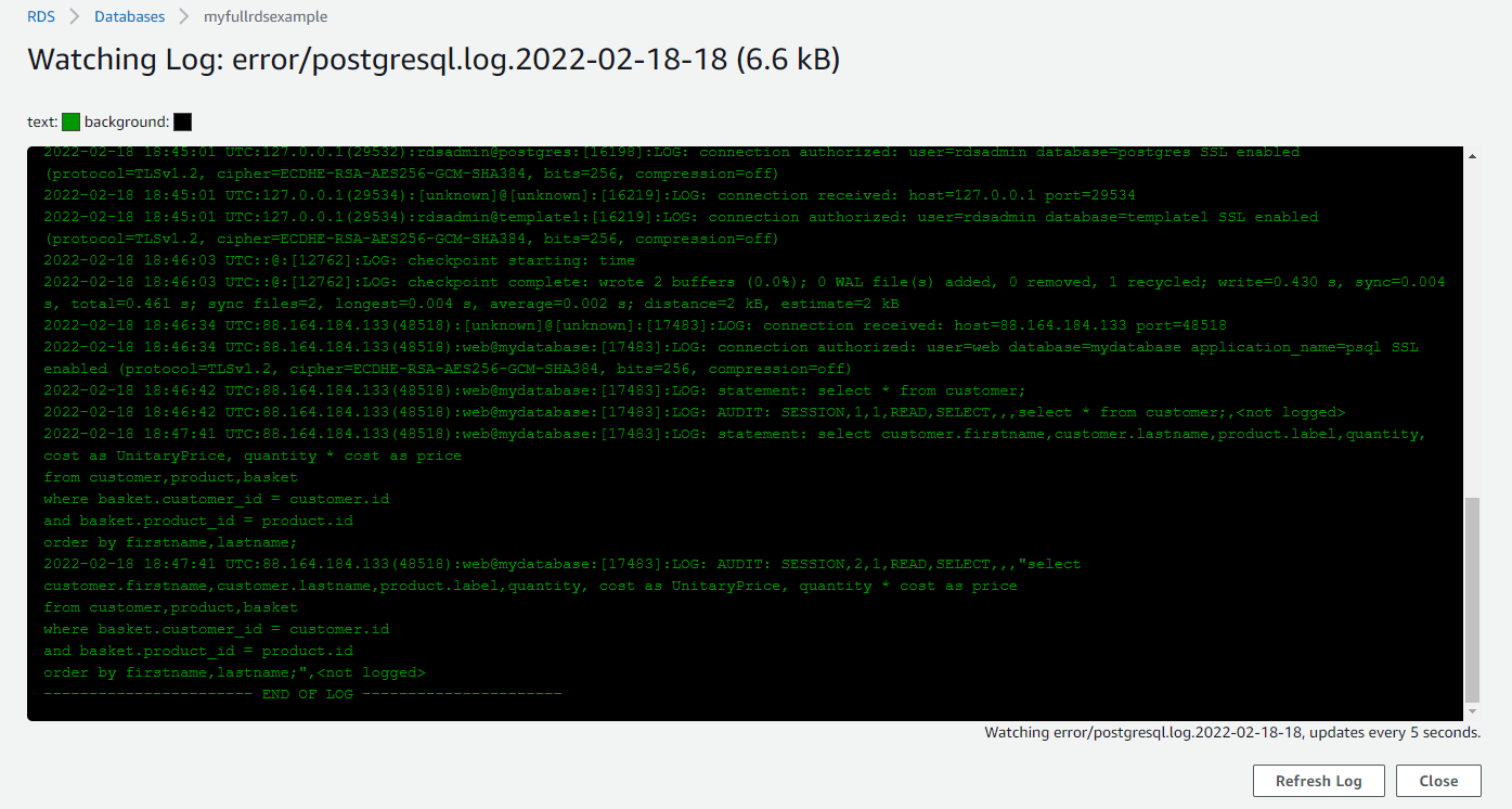 Lorsque la base RDS a été déployée, l’extension est active et fonctionne. On peut déjà ausculter les logs qui sont envoyés. D’abord depuis la console RDS : Onglet Logs & Events, trier les fichiers par la colonne Last Written, sélectionner le dernier log et cliquer sur le bouton watch.
