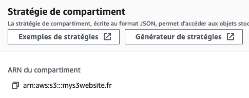 Enfin, il vous faut rajouter une stratégie de compartiment (bucket policy) pour autoriser l’accès en lecture aux fichiers de votre bucket.
