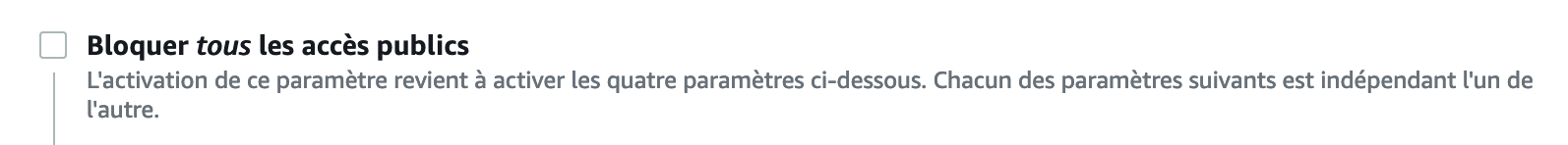 En effet, tous les éléments de ce bucket S3 sont privés. Pour pouvoir y accéder, il faut rendre l’accès à ce bucket et ses éléments publics.