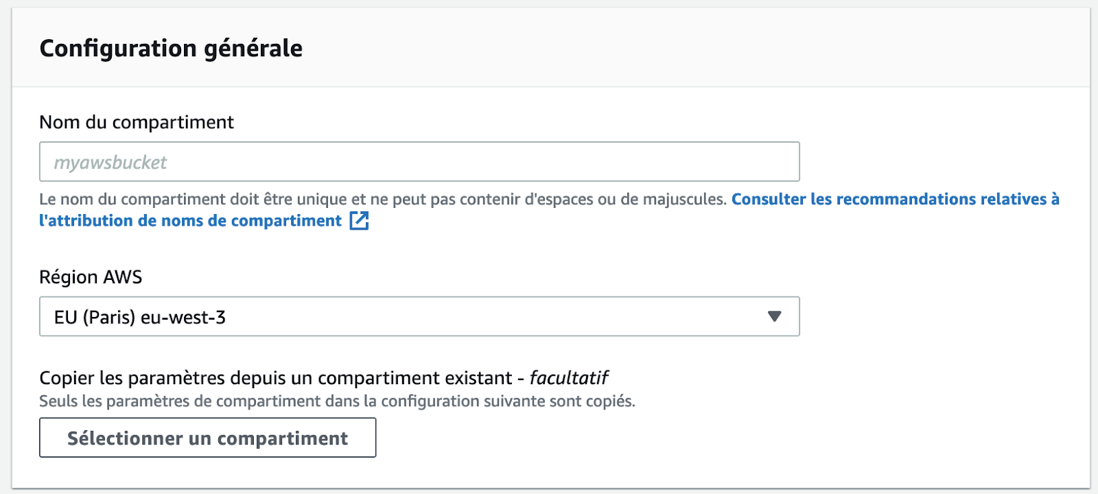 Le nom doit obligatoirement correspondre à l’URL d’accès à votre site. Si l’URL de votre site est : mys3website.fr alors le nom du compartiment doit être le même.
