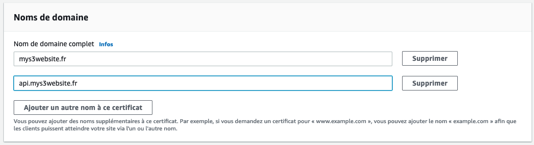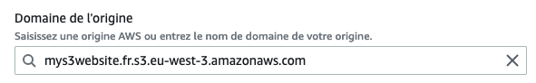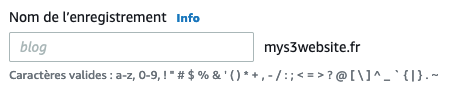 Vous devez renseigner le nom de domaine de votre site. Vous êtes libre d’ajouter des sous-domaines (ex : api.mys3website.fr) si vous en avez la nécessité.