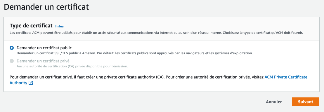 Par défaut, c’est un certificat public. Vous pouvez aller à la page suivante.