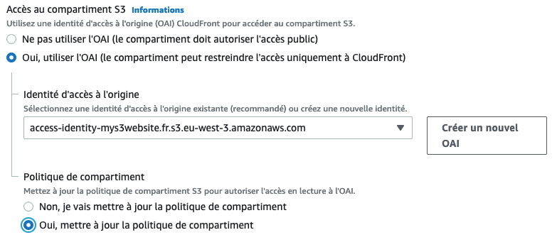 Vous pouvez créer un nouvel OAI et le sélectionner puis demander à ce que la politique de compartiment se mette à jour automatiquement.