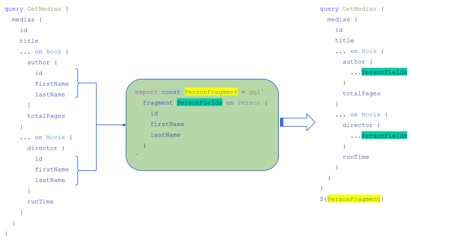 En plus des inline fragments, il existe les fragments qui permettent de mutualiser des morceaux de requête côté client. Dans l’exemple précédent, les objets author et director possèdent les mêmes champs id, firstName et lastName. On pourrait donc les mutualiser dans un fragment PersonFragment sous la forme suivante :