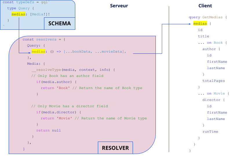Il faut tout d’abord déclarer la query dans le schéma et écrire le resolver associé (comme pour la query books). C’est ensuite dans le resolver de l’objet Media que l’on va utiliser une fonction spéciale __resolveType fournie par apollo-server et qui va nous permettre de définir le type d’implémentation qui va être retourné, en fonction des champs disponibles dans l’objet : si l’objet possède un champ author, alors on renverra un Book; sinon, si l’objet possède un champ director, on renverra un Movie.