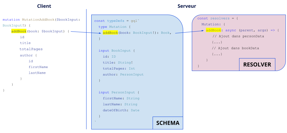 Comme dans l’exemple, on peut utiliser des objets de type input (BookInput et PersonInput), où chaque champ représente un argument, ce qui peut être pratique dans le cas où l’on veut modifier un objet complexe (au lieu de passer les champs un à un).