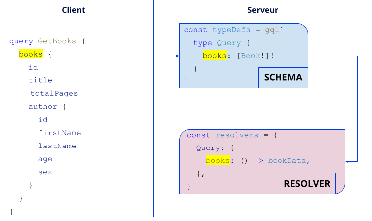 GraphQL arrive à faire le lien entre le client et le serveur via le nom de la méthode que l’on veut appeler (ici, books surligné en jaune). Une fois la requête reçue, le serveur va vérifier que celle-ci existe bien dans le schéma sous le type Query et qu’elle possède les bons paramètres et type de retour (ici, pas de paramètre mais une liste de Book en retour).