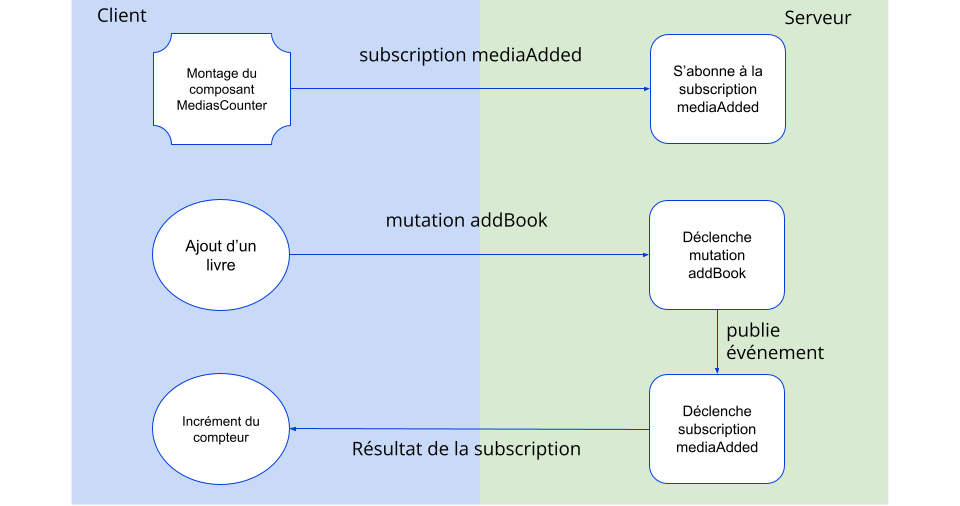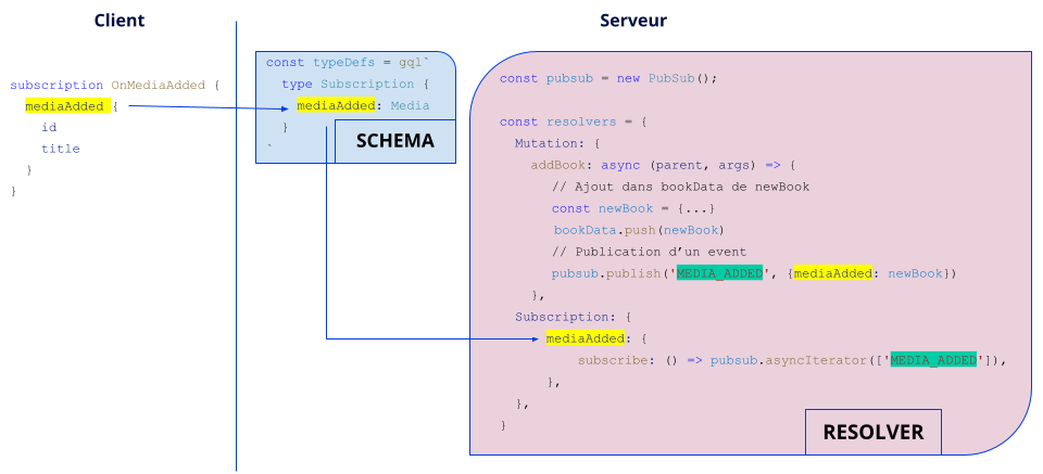 La différence notable avec les queries et mutations est l’utilisation d’un outil de publish/subscribe (ici PubSub via la librairie graphql-subscriptions) qui permet de s’abonner à un événement (pubsub.asyncIterator(['NOM_EVENT'])) et de publier un événement (pubsub.publish('NOM_EVENT', {mediaAdded: newBook})).