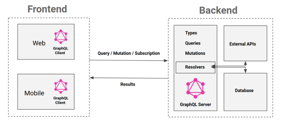 Ci-dessous un schéma récapitulant le fonctionnement de GraphQL avec ces mots-clés spécifiques, dont on verra l’utilisation dans la suite de cet article :