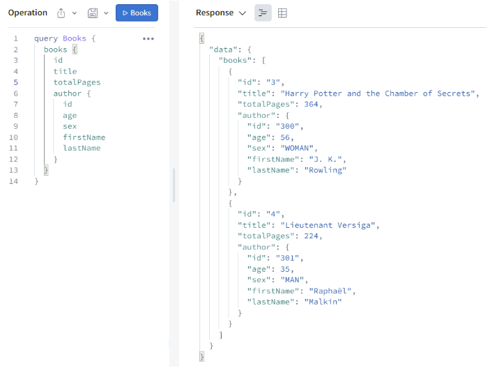 On peut noter que les autres champs des objets Book (id, title, totalPages) ou Person (id, firstName, lastName, sex) n’ont pas de resolver. Ceci n’est pas une erreur. Il existe en effet des resolvers par défaut qui permettent de mapper automatiquement la donnée source qui possède le même nom que le champ qui est défini dans le schéma. Par exemple, le JSON source renvoie un champ title pour l’objet Book, et le schéma de l’objet Book possède un champ title, donc GraphQL est capable de faire le mapping tout seul. Cela correspondrait à écrire le resolver suivant :