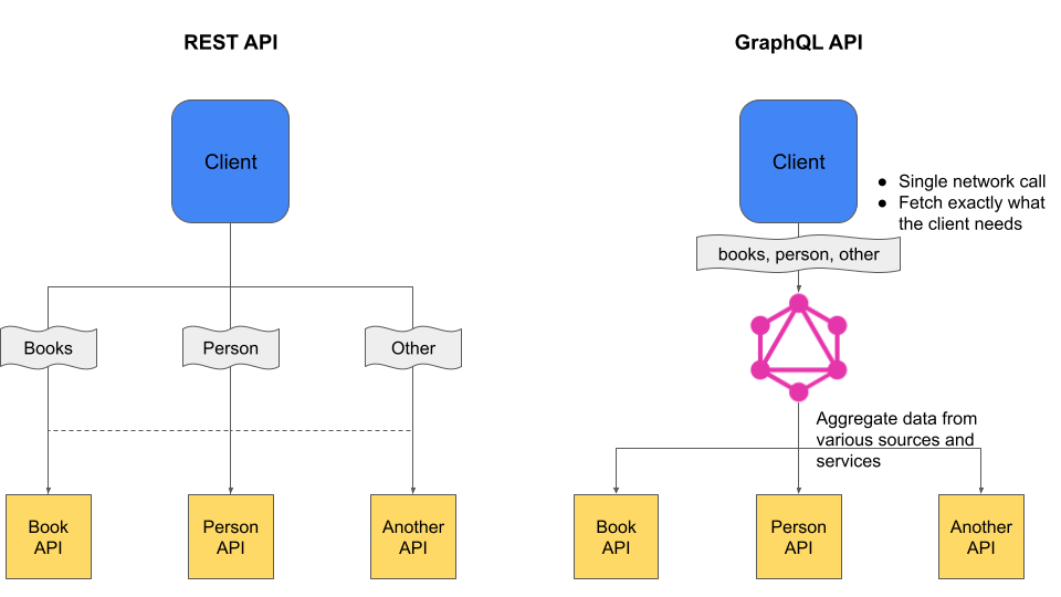 En utilisant le formalisme de REST, le client doit se plier aux endpoints existants côté serveur pour récupérer les ressources dont il a besoin, et donc souvent appeler plusieurs endpoints pour récupérer la totalité des données (voir plus de données que nécessaire). Avec GraphQL, un seul appel est suffisant pour faire la même chose : le client effectuera cet unique appel au serveur GraphQL qui, lui, se chargera d’aller chercher toutes les ressources que la requête demande.