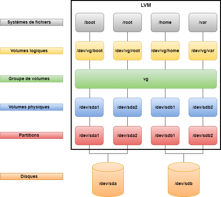 Voici un schéma montrant les différentes couches de l’architecture LVM :