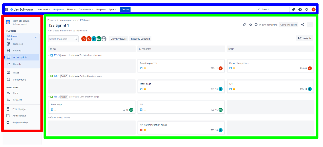- La zone principale (en vert) avec un tableau du projet (ici une vue sur le sprint en cours)