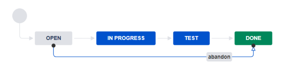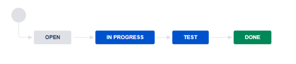 Le rond gris correspond à l’action de création d’un ticket. Après sa création, il se trouve dans l’état “Open”. Il va transiter de l’état “In Progress”, “Test” et “Done” dans cet ordre strictement.