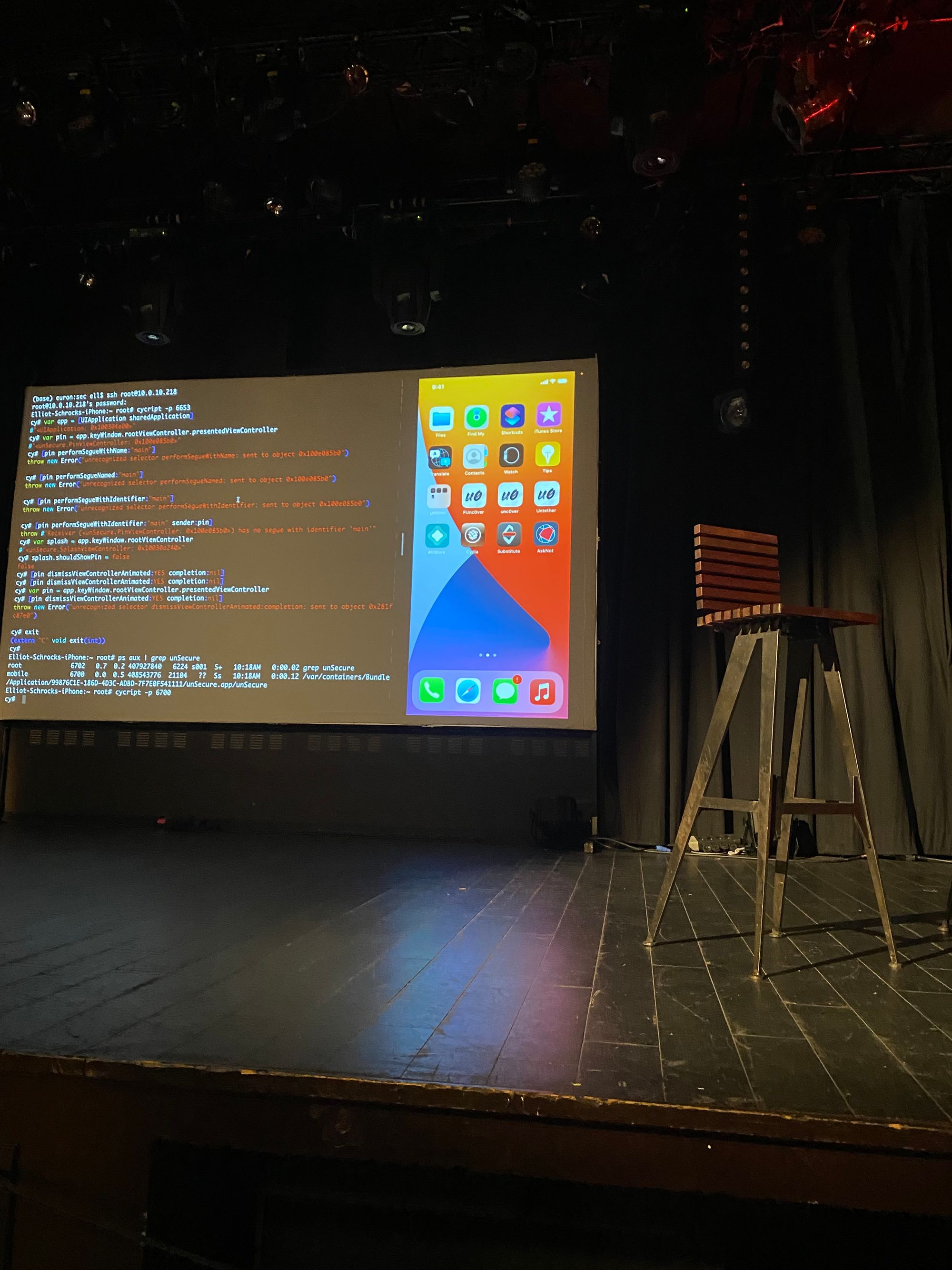 Elliot commence par charger l’application cible sur un iPhone jailbreaké et utilise cycript pour injecter et évaluer des commandes Objc directement dans le processus de l’application. Il est capable d’appeler dismiss sur des viewController et de réaliser des transitions directement depuis son mac connecté via ssh à son téléphone.