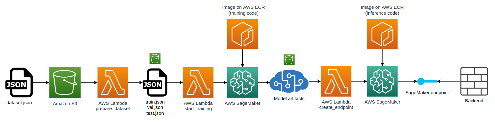 Nous nous attaquons ici au plus gros point, même si dans le cadre du projet chatbot, puisqu’il ne s’agissait que d’un stage, l’industrialisation souhaitée était quelque peu allégée par rapport aux standards habituels. Nous ne voulions pas, par exemple, mettre en place de vérification des performances du modèle obtenu avant qu’il soit déployé et utilisé. Le gros du travail se concentrait donc sur l’automatisation des étapes permettant de déployer un modèle. Concrètement, nous souhaitions que lorsqu’un dataset au format JSON est déposé dans un bucket S3 (espace de stockage sur AWS), un entraînement soit automatiquement lancé puis qu’un endpoint soit créé sans la moindre action de notre part.