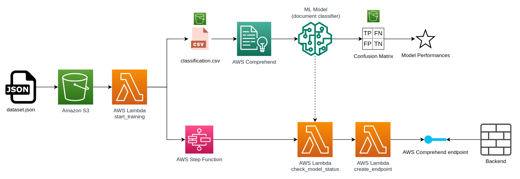 - Lorsqu’un dataset JSON contenant les données d’entraînement (ne respectant pas les contraintes imposées par Comprehend) est déposé dans un bucket S3, une lambda function (start_training) est lancée.