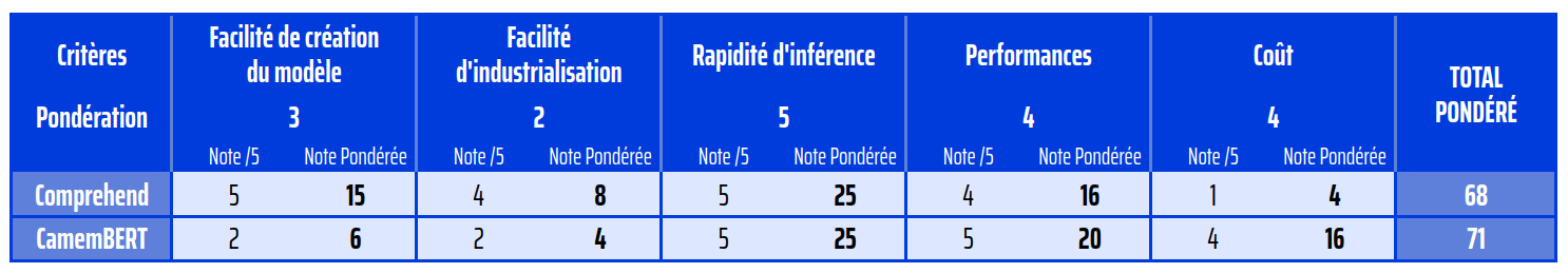Toutes ces comparaisons nous permettent donc de compléter la matrice de décision présentée au début de cet article, ce qui donne le résultat suivant (voir figure 9). L’addition de l’ensemble des notes pondérées donne la solution basée sur CamemBERT gagnante de ce grand match. Les résultats sont toutefois extrêmement serrés (68 vs 71) et la tendance pourrait tout à fait être différente selon vos propres critères, pondérations et compétences.