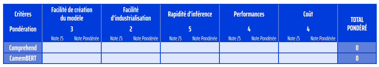 Pour le projet chatbot, le critère le plus important (coefficient 5) était celui de la rapidité d’inférence (le chatbot doit répondre aux questions quasi instantanément). La performance du modèle et le coût de la solution sont également 2 critères importants (coefficient 4). Si l’industrialisation du modèle est essentielle, le fait qu’elle soit facilement réalisable n’était pas spécialement primordial, ce qui explique le coefficient 2. Enfin, cette réflexion est aussi valable pour le dernier critère (facilité de création du modèle) qui a toutefois un peu plus d’importance (d’où le coefficient 3).