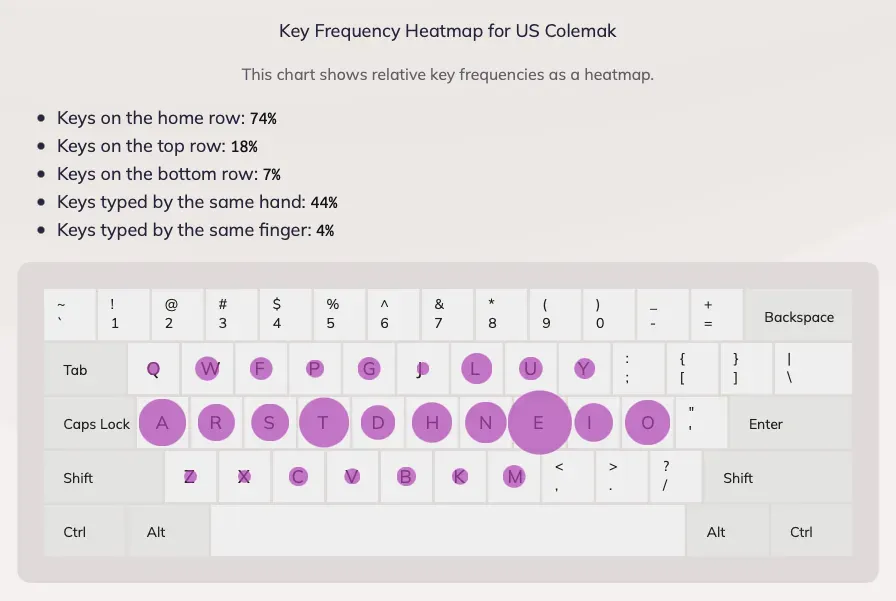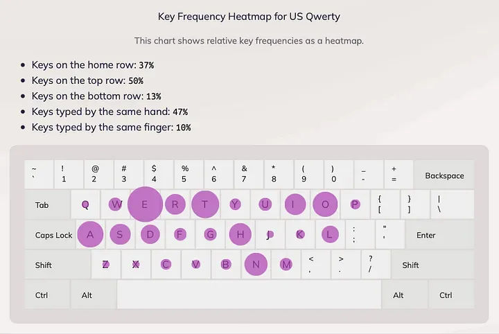 D’après keybr.com, voici la répartition des touches les plus utilisées en Qwerty dans la langue de Shakespeare — l'anglais :