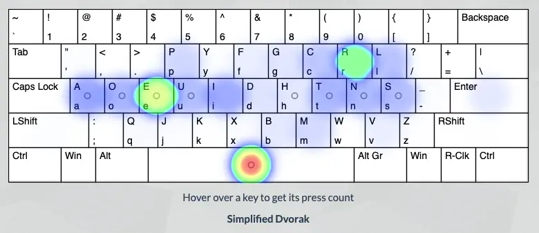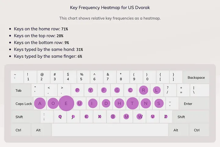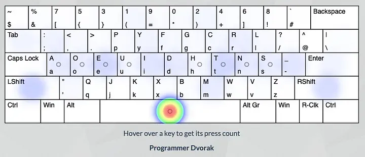 Créé par August Dvorak en 1939 pour être le meilleur clavier anglais, il tente de régler les problèmes du Qwerty et optimise plusieurs choses :