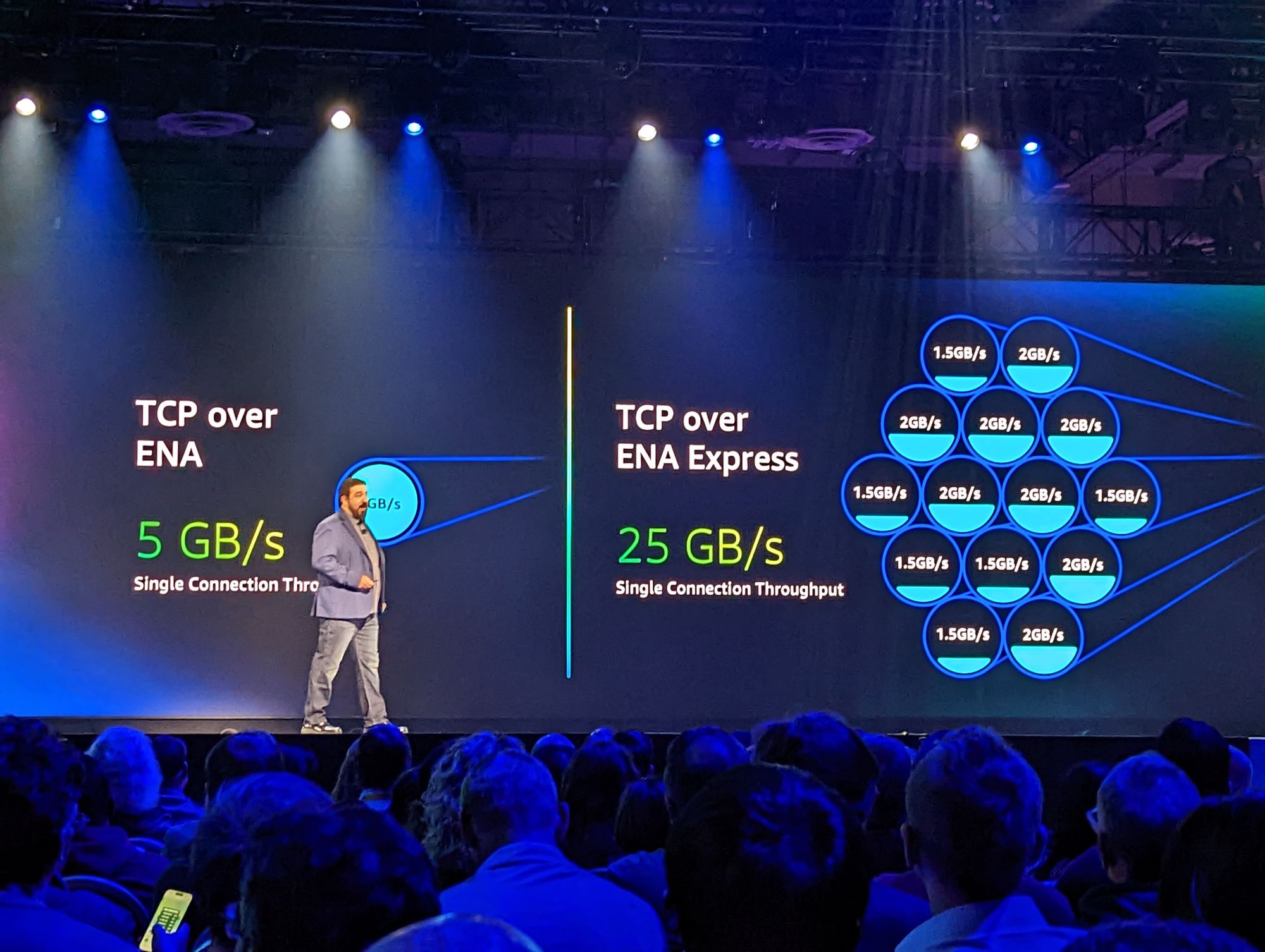 En s’appuyant sur le protocole Scalable Reliable Datagram (SRD), ENA express diminue la latence jusqu’à 50% par rapport au TCP standard tout en augmentant la bande passante maximale par flux de 5 Gbps à 25 Gbps. ENA Express est activable sur les ENA existantes ou nouvelles pour profiter de ces performances entre les instances c6gn fonctionnant dans la même zone de disponibilité.