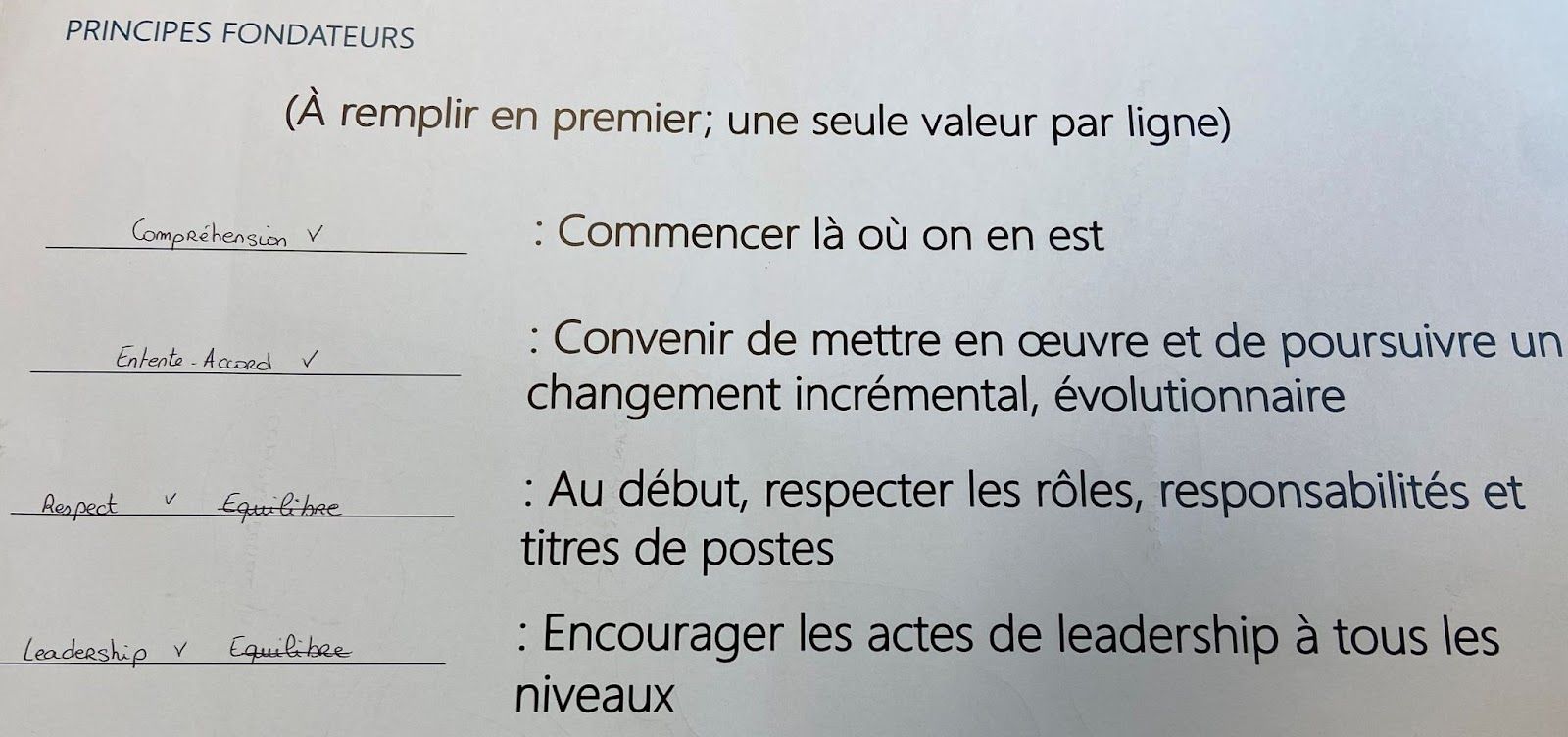 S’en est suivi une session de Codev (co développement) express ou l’un des participants nous a explicité une situation complexe à laquelle il fait face. L’objectif de l’exercice était donc d’identifier les 3 valeurs qui selon nous manquaient à son dispositif. Quelles sont les valeurs à travailler en priorité pour sortir de cette situation ?