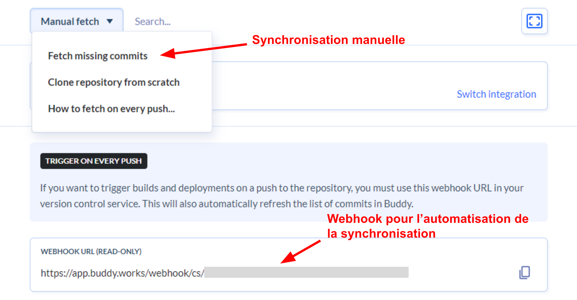 Le deuxième onglet “Code” permet de visualiser le code copié depuis notre dépôt Git. C’est notamment à partir de cet onglet que nous pouvons synchroniser manuellement les modifications apportés dans le dépôt ou encore récupérer le webhook à ajouter dans Git pour automatiser la synchronisation disponible dans le sous-onglet “Deliveries”.