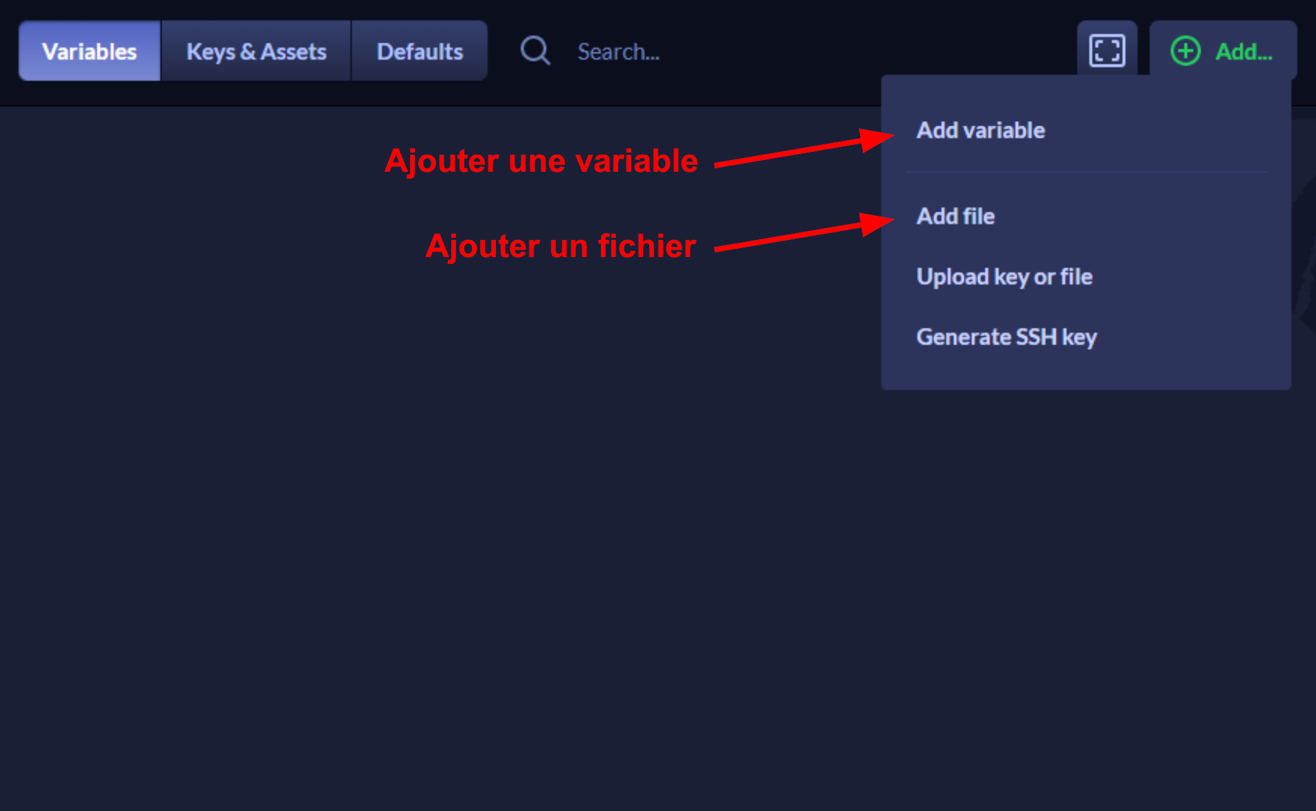 Dans cet onglet, il sera possible d’ajouter des objets d’environnement utilisables dans nos différentes pipelines. Ces objets peuvent être des variables (des tokens, etc.) ou encore des fichiers (des clés de sécurité, des fichiers de configuration, etc.).