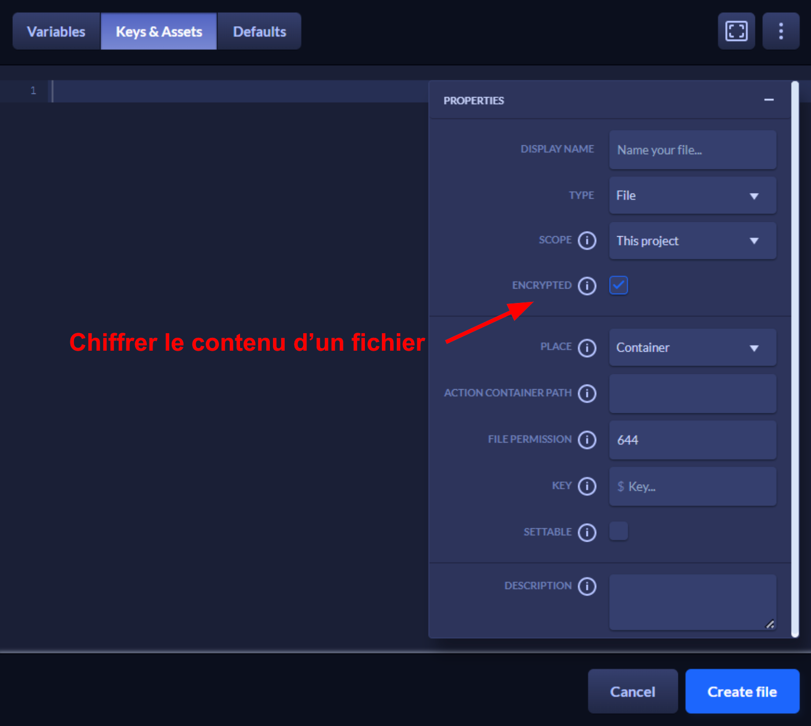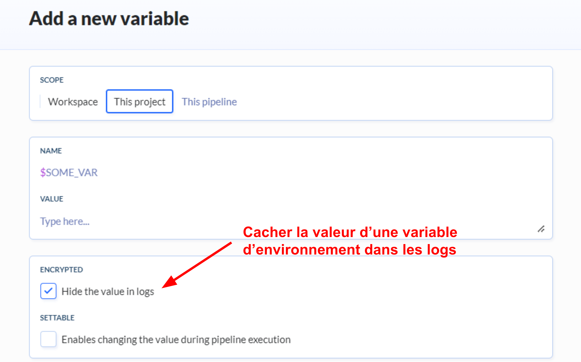 Il est possible de configurer ces objets comme étant des données sensibles. Ainsi, la valeur des variables sera masquée dans les logs des pipelines et la lecture du contenu des fichiers sera impossible à travers les actions des pipelines.
