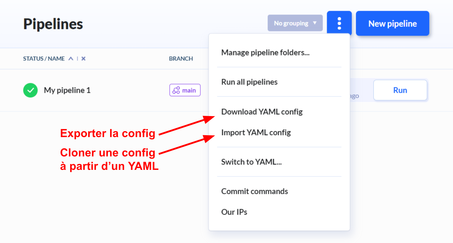 Il est possible d’exporter son projet dans un format YAML afin de pouvoir utiliser les mêmes configurations dans d’autres projets. Ainsi, dans un autre projet Buddy, on peut importer une configuration YAML qui aura pour conséquence de créer les pipelines nécessaires.