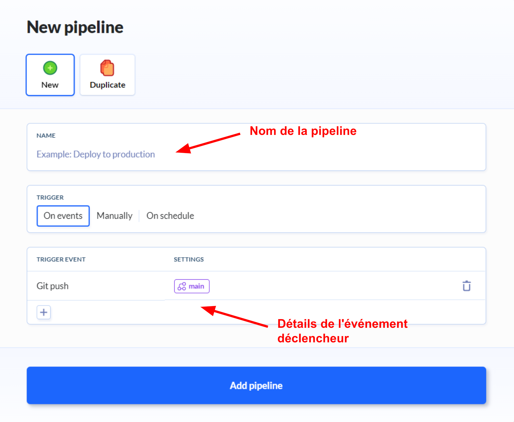 Le déclenchement manuel nécessite que l’utilisateur déclenche lui-même la pipeline à chaque fois. Le déclenchement périodique permet de lancer la pipeline selon un intervalle de temps défini.