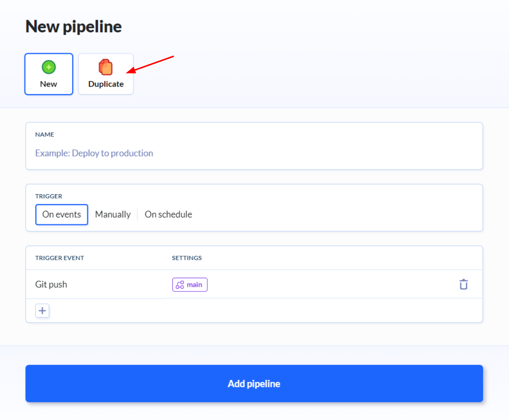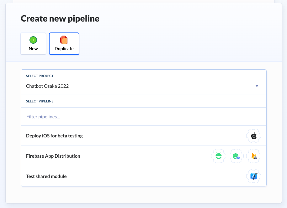 Les pipelines créés dans un projet Buddy peuvent être réutilisés dans d'autres projets assez facilement. Pour cela, dans un nouveau projet du même Workspace, sur la page de création d’une pipeline, il faut sélectionner l’onglet “Duplicate”.