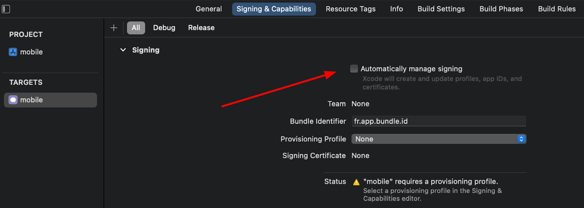 Pour faciliter l’utilisation des certificats de distribution et provisioning profiles durant le développement (en local sur la machine du développeur) et pour la distribution (au niveau de la CI/CD), il est préférable de ne pas utiliser la signature automatique du projet dans XCode et choisir manuellement les certificats à utiliser pour le projet. Cette option peut être décochée dans les paramètres du projet. Ainsi, vous pourrez facilement utiliser les mêmes certificats sur n’importe quel poste/machine.
